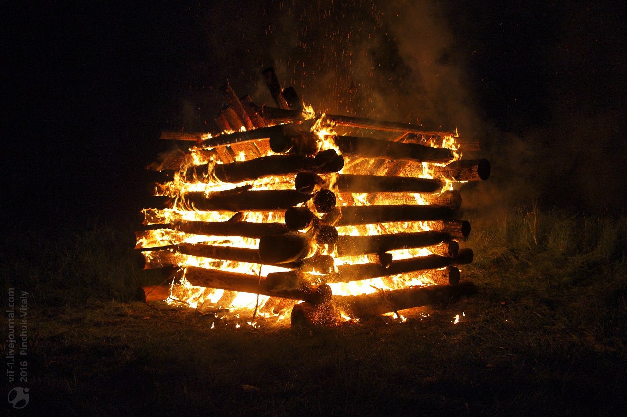 Пока смотрели очередной фильм подожгли БК который ребята из других лагерей весь день не складывали а строили!!! Пламя сначала было яркое но не грело и многие подошли поближе, но спустя минуту БК набрал силы и вот уже волна теплого и горячего излучения накрыла нас всех. Пламя поднималось метров на 20 а искры словно звезды вылетали под напором тяги на много выше! Потрясающее зрелищ, ,БК горел и трещал и можно было к нему подходить (а не как в пионерском лагере была некая зона безопасности) Стоять у стены огня это захватывающее зрелище.